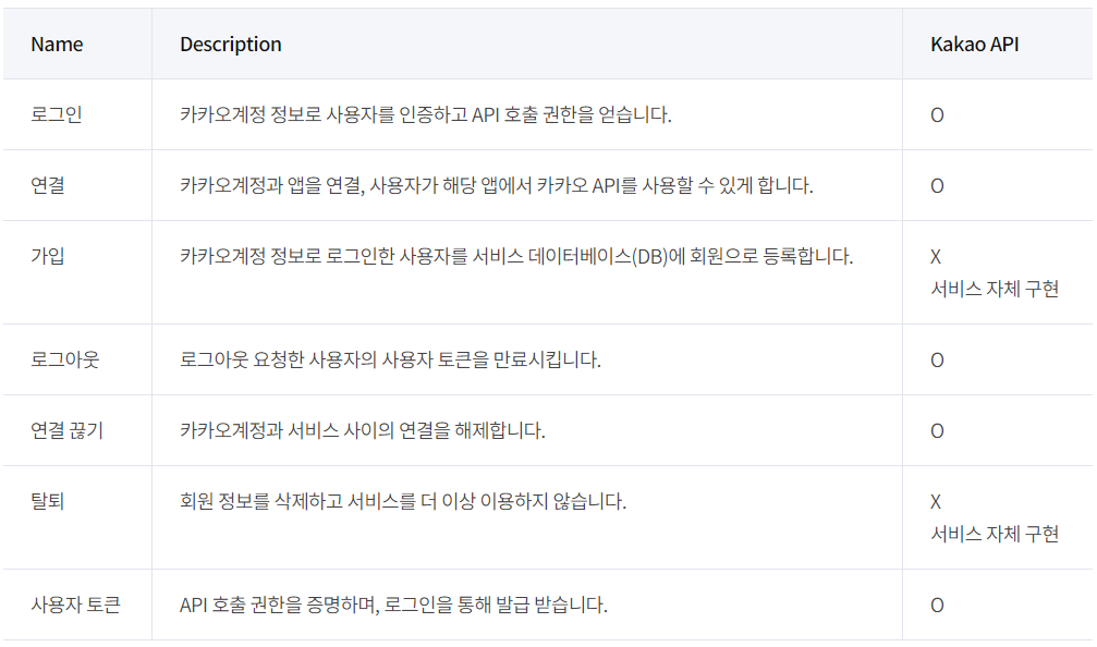 Kakao Developers에서 제공하는 기능을 도표로 정리하면 다음과 같다.