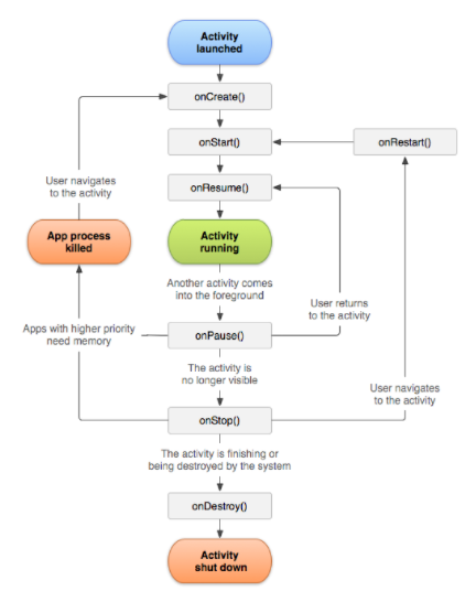 Activity는 Activity가 활동하는 전체 기간에 걸쳐서 여러 상태를 거친다. 또한, 이러한 상태들 간의 전환을 처리하는 데는 Callback Method를 사용할 수 있다. 아래에 그 Callback Method들을 설명한다.