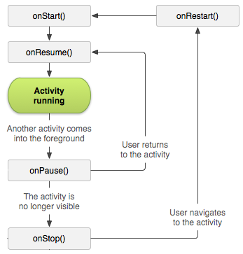 onCreate( )가 완료되면 Activity는 "실행"상태로 전환되고 onStart( )를 통해 Activity의 UI가 사용자에게 보이게 된다. 이 상태에서는 Activity가 Forground로 나오게 된다.