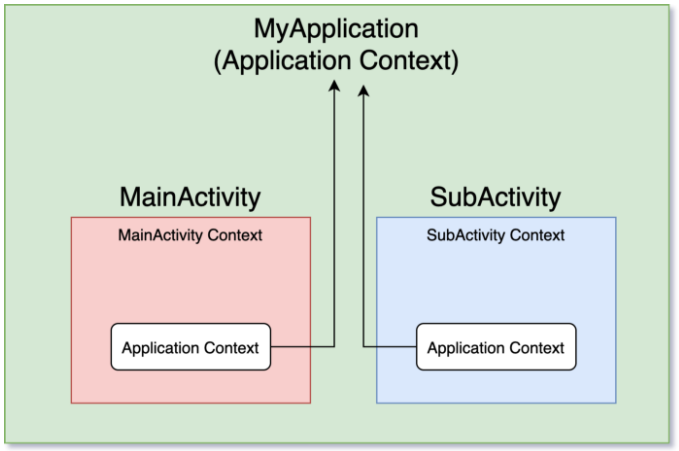 위의 그림은 어플리케이션의 계층 구조를 보이고 있다. 위의 계층 구조에서 Application Context나 Activity Context나 모두 다 같은 Context이지만 Scope가 상이한 것을 볼 수 있다. 지금까지 다룬 내용들로 확인할 수 있듯이, Application Context는 MyApplication, Activity 모두 사용이 가능하다. (단, Activity에서 사용하는 일은 주의할 필요가 있을 것이다.) 또한, MainActivity의 Context는 MainActivity만 사용 가능하고 SubActivity도 마찬가지이다.