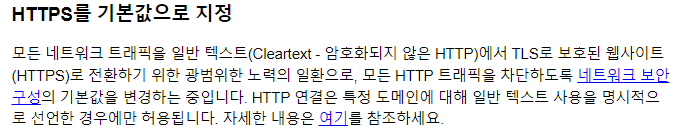 위의 속성은 Android 6.0부터 새로 추가된 속성으로 Android 9.0이전까지는 default value가 true였지만 Android 9.0부터는 https를 지원하기 때문에 false로 바뀌었었다. 이에 따라 http를 사용하기 위해서는 이 속성을 다시 true로 바꾸어야 한다.