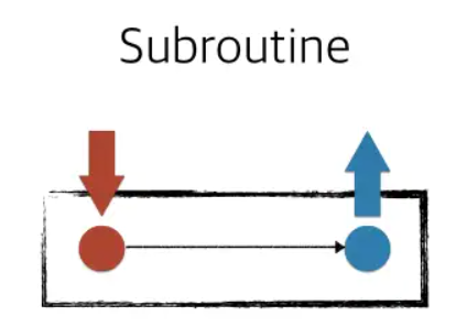 서브 루틴은 진입하는 지점과 빠져나오는 지점이 명확하게 존재한다. 메인 루틴에서 서브 루틴을 호출하여 함수를 시작하면, 서브 루틴의 맨 처음 부분에 진입하여 코드를 실행하고 return을 만나면 함수의 실행이 종료되어 결과값이 호출자에게 돌아간다. 즉, 서브 루틴은 단일 지점에서 시작되고 특정 지점에서 종료된다고 볼 수 있다.