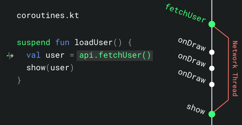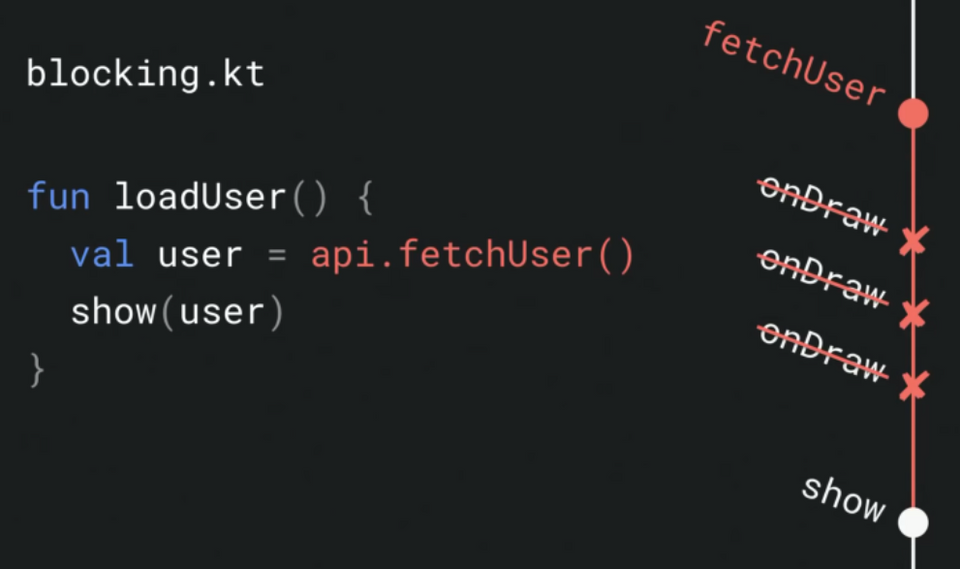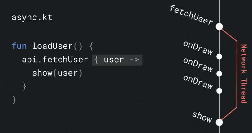 위에서도 언급하였듯이 Main Thread에서 네트워크 작업을 처리하는 것은 UI가 Blocking 되기 때문에 하면 안되는 작업이다. 아래 그림처럼 Main Thread에서 fetchUser( )를 호출하면 UI를 그리는 onDraw( )가 Blocking 되는 위험이 있다.
