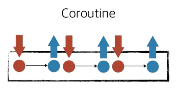 코루틴(Coroutine)도 방식은 비슷하다. 서브 루틴은 진입하여 함수의 마지막까지 실행한 후 최종적으로 return 하는 반면, 코루틴은 왼쪽 그림처럼 Block안에 진입하여 코드를 실행하다가 중간에 빠져나갈 수 있다. 이러한 형태가 반복되는데 즉, 함수에 진입할 수 있는 진입점도 여러 개이고 빠져나갈 수 있는 탈출점도 여러 개다. 단일 지점에서 시작하고 특정 지점에서 종료되는 것은 서브루틴과 동일하지만 임의 지점에서 멈출 수 있고 해당 지점에서 재개될 수도 있다는 특징이 있다.