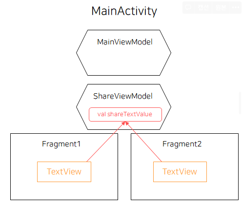 아래와 같이 Activity와 Fragment간의 공동의 ViewModel을 두어 Fragment 간에 데이터 공유를 하는 컨셉을 생각해볼 수 있다.